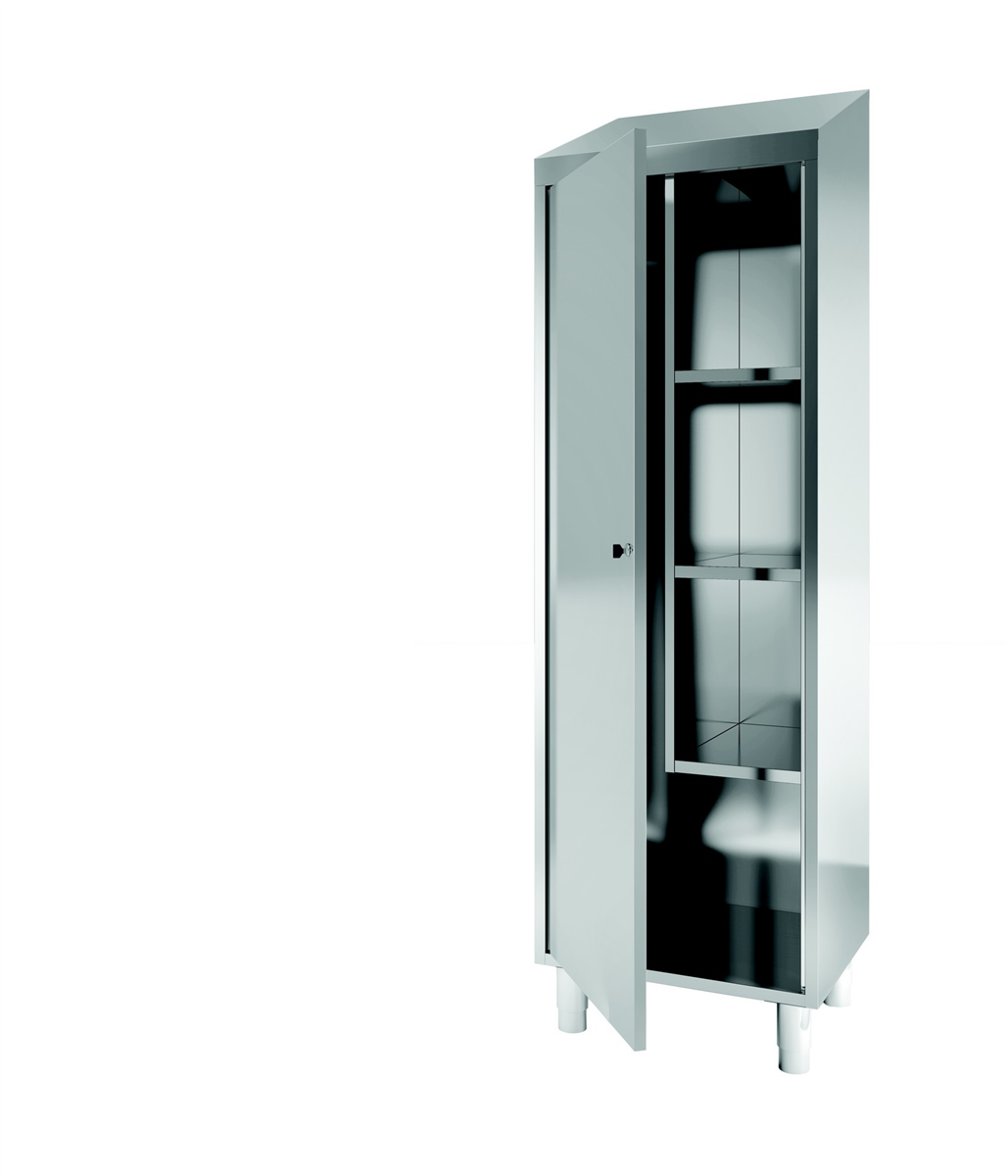 INOXINOX – Inox AISI 304. Portes battantes, toit pente. Paroi de séparation centrale. 3 étagères fixes, fermeture à clé. Produit conçu pour les cuisines professionnelles. Durable et facile à utiliser.