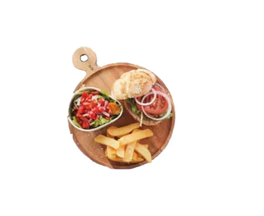 La Planche à hamburger en acacia rond ø 25 cm avec poignée - GAFIC est conçue pour les restaurants, food trucks et professionnels de la restauration. Fabriquée en bois d'acacia, elle allie élégance naturelle, durabilité et hygiène pour une présentation impeccable de vos hamburgers.